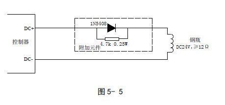 GST-QKP01 驅動鋼瓶電磁閥輸出的布線方式如圖5-5所示。附加元件應置于線路的末端、接近鋼瓶電磁閥處。